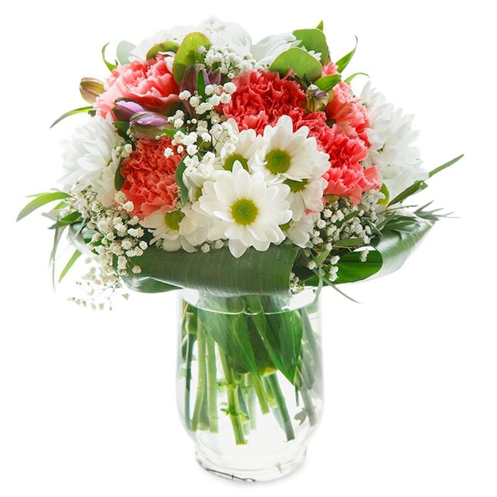 Capturing the lively spirit of Marks Gate's local gardens, this beautifully composed bouquet radiates effortless joy. In a meticulously clean white gift bag with neatly looped handles, a symphony of coral, peach, and bold red carnations bloom with plush, ruffled petals-each touch inviting a sense of warmth. Interspersed among these vibrant blooms, white daisies with glimmering yellow-green eyes smile forth, hinting at the optimism of spring days in the local parks. Misty sprays of baby's breath hover among the flowers, their airy, delicate petals bringing softness and innocence, while a few gracefully concealed purple-tipped buds add intrigue at one edge. Lush arcs of deep green, polished foliage cradle the blooms, suggestive of leafy walks and tree-lined neighbourhood streets. The display forms a naturally rounded, bountiful shape-suggesting both abundance and thoughtful design. The bouquet stands ready for gifting, its fresh, celebratory feel perfectly suited for a birthday, anniversary, or simply as a cheerful surprise delivered to a doorstep in Marks Gate. Every detail, from the interplay of colours to the expertly placed greenery, reflects the artistry and heart that defines this local floral creation. This beautifully arranged bouquet encapsulates the gentle radiance of Marks Gate's spring and the joy found in small gestures. At its heart, crisp white daisies with glowing lime centers stand proud among plush coral-pink carnations, each ruffle echoing with warmth and softness. Wisps of ethereal gypsophila thread assertively through the bouquet, casting a dreamy, star-like sparkle reminiscent of morning light over Valence Park. Subtle buds, possibly blush-toned alstroemeria graced with streaks of purple, peek shyly amidst the blossoms, their understated elegance promising new blooms. Lush greenery-including the velvety, silver-green of eucalyptus and deeper-toned foliage-forms a harmonious backdrop, cradling each flower with supportive grace. The palette is fresh and uplifting, suitable for marking life's happiest moments-whether celebrating a birthday, congratulating someone on a milestone, or offering a cheerful pick-me-up to a loved one in Marks Gate. Every stem is thoughtfully placed, creating a tranquil yet exuberant display that feels like a florist's devotion brought to life. The result is a bouquet that radiates gratitude, celebration, and hope, thoughtfully available for same-day delivery to homes and businesses across the local area. Radiating warmth and gentle abundance, this Marks Gate-inspired bouquet is a harmonious blend of coral-pink and white hues arranged in a crystal-clear vase. Coral carnations-with their delicately frilled petals and lush, rounded forms-form a dynamic core that feels inviting and alive. Between these, snowy chrysanthemums contribute a touch of classic elegance, while crisp daisies with soft yellow-green centers deliver playful, sunlit charm, reminiscent of parks and green spaces found off Padnall Road. Wispy gypsophila threads through, imparting a feathery softness that tempers the bolder blooms, and closed magenta alstroemeria buds lend hidden depth and anticipation. The whole design is wrapped in a graceful collar of broad, glossy green foliage, with slender leaves weaving upward, drawing the eye through layers of color and texture. Resting in fresh, clear water, the stems are fully visible, reinforcing a sense of just-cut brilliance. The lighting, even and bright, ensures every petal and leaf appears vivid, shadow-free, and imbued with optimism. This arrangement, lovingly crafted by a Marks Gate florist, is perfect for lifting spirits, celebrating milestones, or simply adding joy and comfort to a familiar space-making it a meaningful gift for birthdays, thank you wishes, or moments of quiet remembrance.